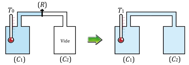 Lorsqu’on ouvre le robinet (R), le gaz s’engouffre dans le récipient C2 et, au bout de quelques instants, la pression du gaz se stabilise : un nouvel état d’équilibre thermodynamique est atteint et on note  T1 la température du gaz dans ce nouvel état d’équilibre.