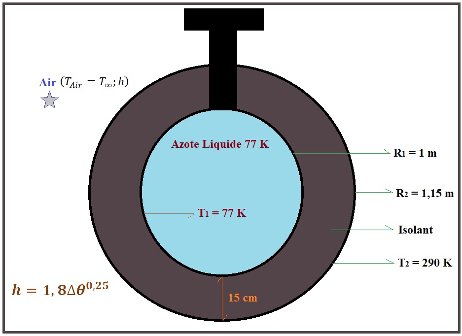 On stocke de l’azote liquide à 77 K dans une sphère de 1 m de rayon intérieur et d’épaisseur négligeable. On entoure la sphère d’un isolant de conductivité 0,02 W.m-1.K-1 et d’épaisseur 15 cm. On recouvre la surface extérieure par une sphère d’aluminium supposée parfaitement réfléchissante. On suppose que la température de la paroi intérieure est aussi à 77 K.