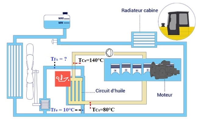 Un ensemble moteur (voir figure ci-dessous) est refroidi, en régime permanent, par la circulation forcée d’un fluide caloporteur (huile moteur), à un débit de 1200 L/h. Ce fluide est refroidi par un échangeur externe fonctionnant à contre-courant. Il parcourt le tube intérieur d’un échangeur coaxial, à contre-courant avec de l’eau de refroidissement, circulant en double enveloppe, à un débit de 1600 L/h. Le fluide caloporteur entre dans l’échangeur à la température de 140°C, et doit être refroidi à la température de 80°C. L’eau de refroidissement est disponible à la température de 10°C.