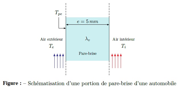 Pour dégivrer la glace accumulée sur la surface extérieure d’un pare-brise d’automobile, de l’air chaud est soufflé sur la surface intérieure du pare-brise. Considérons un pare-brise d’automobile avec une hauteur totale de H = 0,5m et une épaisseur de e = 5mm. La conductivité thermique du parebrise est λv = 1,4W·m−1·K−1. L’air extérieur (à 1 atm) est à Te = −10°C. La voiture roule à une vitesse v =80 km·h−1. L’air à l’intérieur de la voiture est à la température Ti = 25°C. On note Tpe = 0°C, la température sur la paroi extérieure du pare-brise.