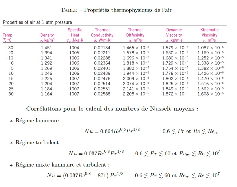 3-) En vue de déterminer le coefficient de transfert convectif de l’air extérieur, à quelle température calcule-t-on les propriétés Thermophysiques de l’air extérieur. Pour cette température, donner ces propriétés Thermophysiques.