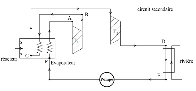 Une centrale nucléaire produit de l’électricité par l’intermédiaire d’un alternateur couplé aux turbines à vapeur T1 et T2. Le fluide caloporteur est de l’eau. A la sortie des turbines, l’eau se refroidit dans le condenseur (l’échange d’énergie thermique peut se faire avec l’eau pompée dans la rivière).