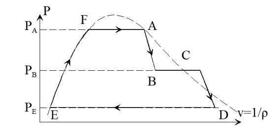 - Les transformations A → B et C → D sont supposées adiabatiques réversibles et correspondent au passage dans les turbines hautes pression (T1) et basse pression (T2).