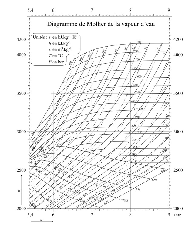2°) Dresser un tableau où figurent les valeurs de h, s, T, P (atm) et x pour les différents points A, B, C, D, E, F. Pour cela, on s’aidera du diagramme de Mollier présenté en fin d’énoncé.