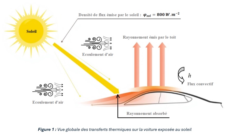 Le toit d’une voiture stationnée sur un parking non couvert absorbe 40% du flux solaire incident et émet 20% de ce rayonnement incident (voir figure 1). La face supérieure du toit en contact avec l’air ambiant est faite d’une tôle, en acier inox de couleur gris-claire. L’acier inox est bien connu comme un matériau extrêmement polyvalent qui, grâce à ses excellentes propriétés, tant fonctionnelles que conceptuelles, est présent dans de nombreux domaines et applications. Outre leur excellente résistance à la corrosion, les tôles en acier inox présentent une stabilité et une solidité très élevées par rapport aux matériaux alternatifs.