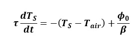 5°) Résoudre l’équation différentielle obtenue à la question précédente et tracer l’évolution dans le temps, de la température du toit (TS(t)). On fera explicitement apparaître sur ce graphe le paramètre τ et on prendra à l’instant initial, TS(0) = Tair.