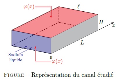 Un réacteur nucléaire possède des canaux d’écoulement de section rectangulaire. On note L = 2m la longueur du canal, l = 30cm sa largeur et H = 2cm sa hauteur. Le fluide circulant dans ces canaux est du sodium liquide. On s’intéresse plus particulièrement à l’un de ces canaux dans lequel s’écoule le sodium liquide avec un débit massique qm = 10,2 kg·s-1.