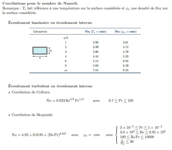 Certaines corrélations pour le calcul du nombre de Nusselt sont fournies dans le formulaire.