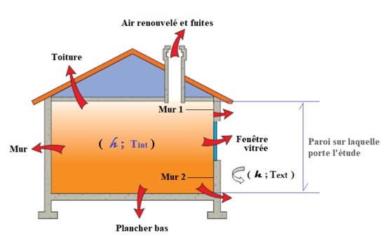 L’intérieur de cette maison est à une température fixe Tint et l’extérieur est également à température constante Text, avec Tint > Text. On admettra que le coefficient de convection de l’air ambiant (intérieur et extérieur) reste inchangé : h = 10 Wm-2K-1. Les parois de cette maison seront assimilées à des murs plans infinis, homogènes et isotropes sans terme source. De plus, on supposera être en régime stationnaire.