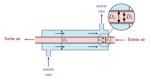 Pour refroidir un débit de 9,4 kg/h d’air de 576 °C à 178 °C, on le fait passer dans le tube central d’un échangeur bitube à contre-courant en cuivre de longueur L, de diamètre Di = 2 cm, d’épaisseur e = 1 mm  (voir figure ci-dessous) et on prendra la conductivité du cuivre égale à λCu = 401 W.m-1.K-1 et heau = 500 W.m-2.K-1, le coefficient d’échange convectif côté eau.