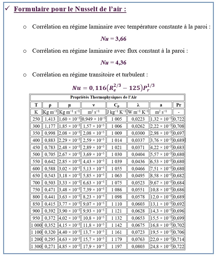 Les propriétés Thermo-physiques de l’air seront prises à une température moyenne, entre les températures d’entrée et de sortie. Un formulaire donnant les corrélations empiriques de Nusselt et une table des propriétés Thermo-physiques sont fournis en fin d’énoncé.