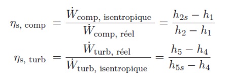 Le rendement isentropique de la compression est ɳs, comp = 80% et celui de la détente est ɳs, turb =75%. On donne le volume molaire moyen, supposé constant, lors de la compression ν12 = 0,1269 L.mol-1 et celui de la détente ν45 = 0,5213 L·mol-1 également supposé constant. On se place en régime permanent et on négligera les variations d’énergies cinétique et potentielle. On rappelle que les rendements isentropiques de compression et de détente s’écrivent :