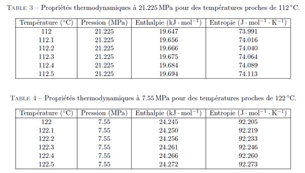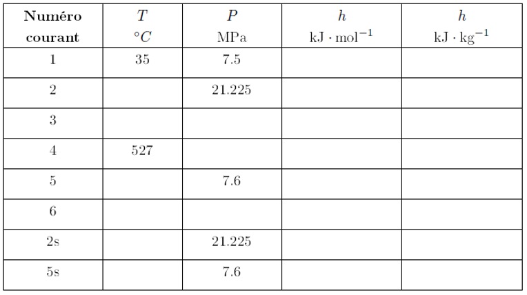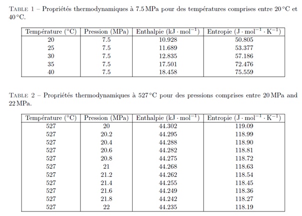 On donne la température critique Tcr et la pression critique Pcr du CO2 : Tcr = 304,18K et Pcr = 73,8 bar. On rappelle les masses molaires du carbone et de l’oxygène : MC = 12 g·mol-1 et MO = 16 g·mol-1. Les tables Thermodynamiques du CO2 supercritique sont fournies en Annexe-1 à la fin de cet énoncé. On souhaite avoir une puissance nette en sortie de P = 1MW.